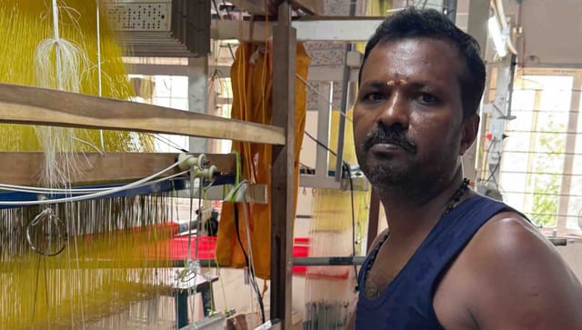 To weave a traditional korvai 6 border—a complex, labor-intensive technique where the border is woven separately and interlocked with the body—requires the same week of meticulous labor whether the material is pure or fake. But the market punishes him for the material he is given. Where a pure-material version once fetched him ₹8,500 ($95), an impure one now earns him just ₹4,000 ($45).